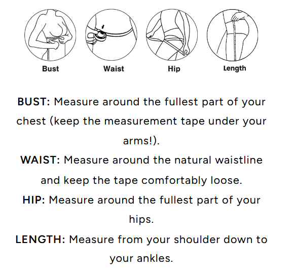 | Size | US/CA | UK/AU | Bust(IN) | Waist(IN) | Hip(IN) | Length(IN) |